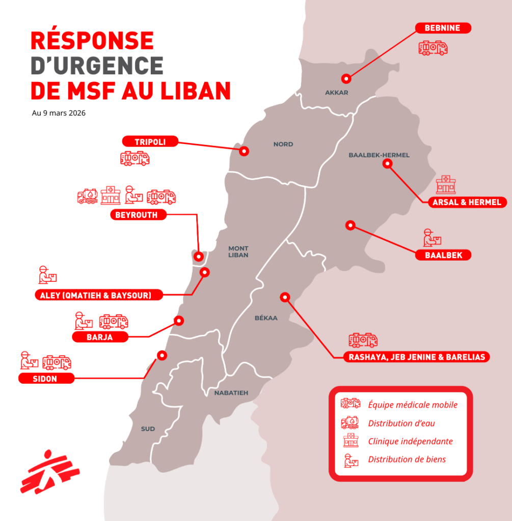 Carte détaillée de la réponse d’urgence de MSF au Liban, au 9 mars 2026.