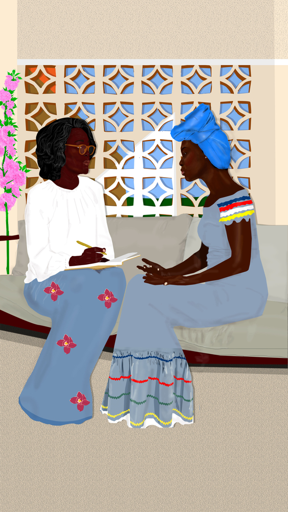 Illustration représentant une survivante de violences sexuelles discutant avec une psychologue en Haïti, figurant dans Violences sexuelles et sexistes à Port-au-Prince, en Haïti, un rapport publié par MSF en janvier 2026. Haïti, 2025. © Lyne Lucien.